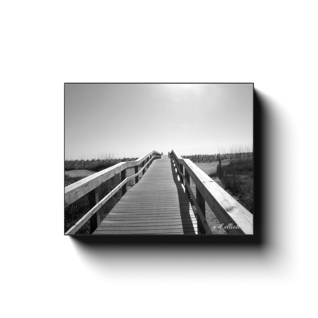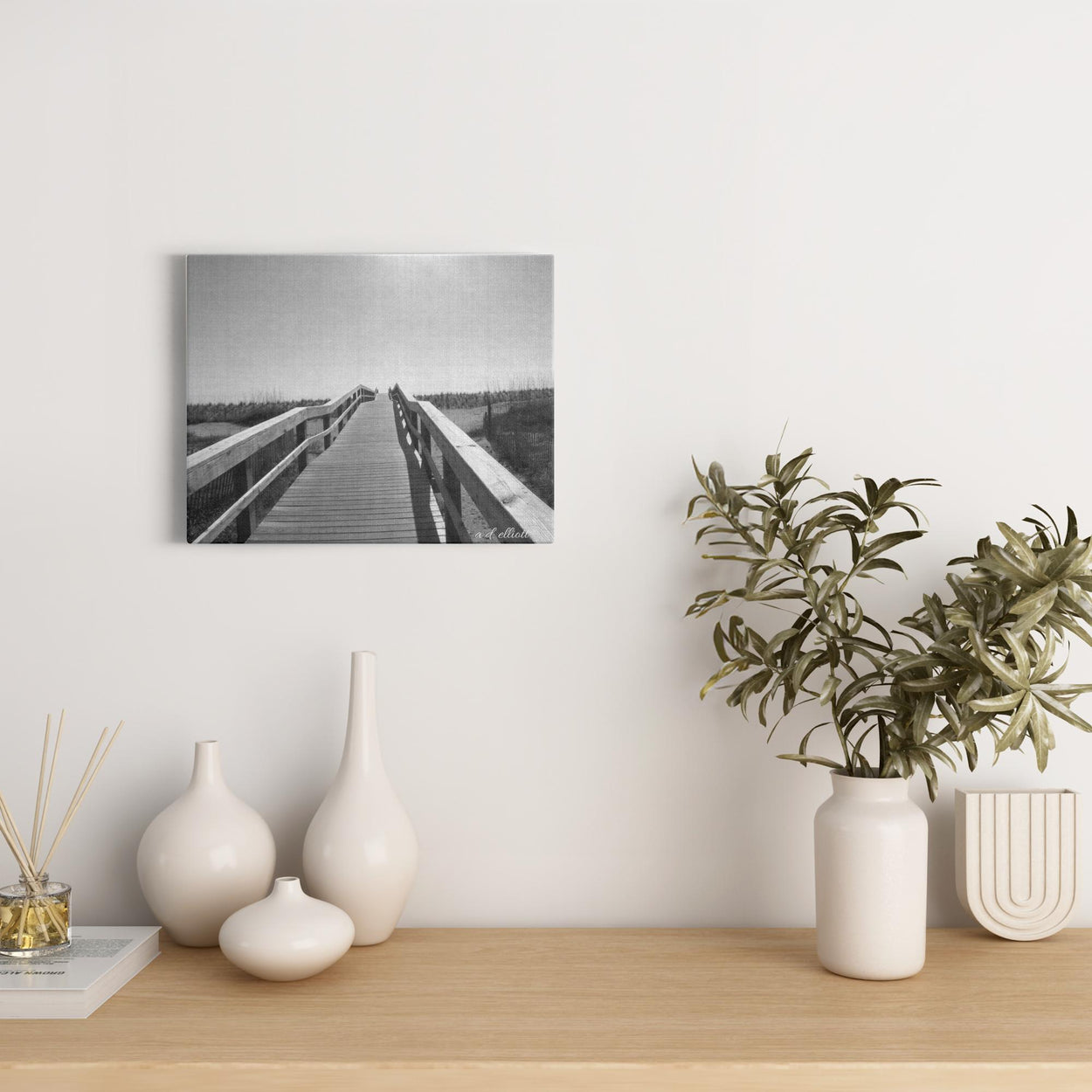 Experience the serene beauty of a black and white photograph capturing a wooden bridge leading to the Atlantic Ocean on Tybee Beach, Georgia, taken by renowned photographer a.d. elliott. This stunning image evokes a sense of tranquility and nostalgia, making it a perfect addition to any art lover's space. 2. Available in print sizes ranging from 8x10 to 24x30, each piece is printed on high-quality, artist-grade canvas and elegantly folded around a lightweight frame, ensuring a gallery-ready presentation. Please allow 14 to 21 days for delivery to receive this exquisite artwork.