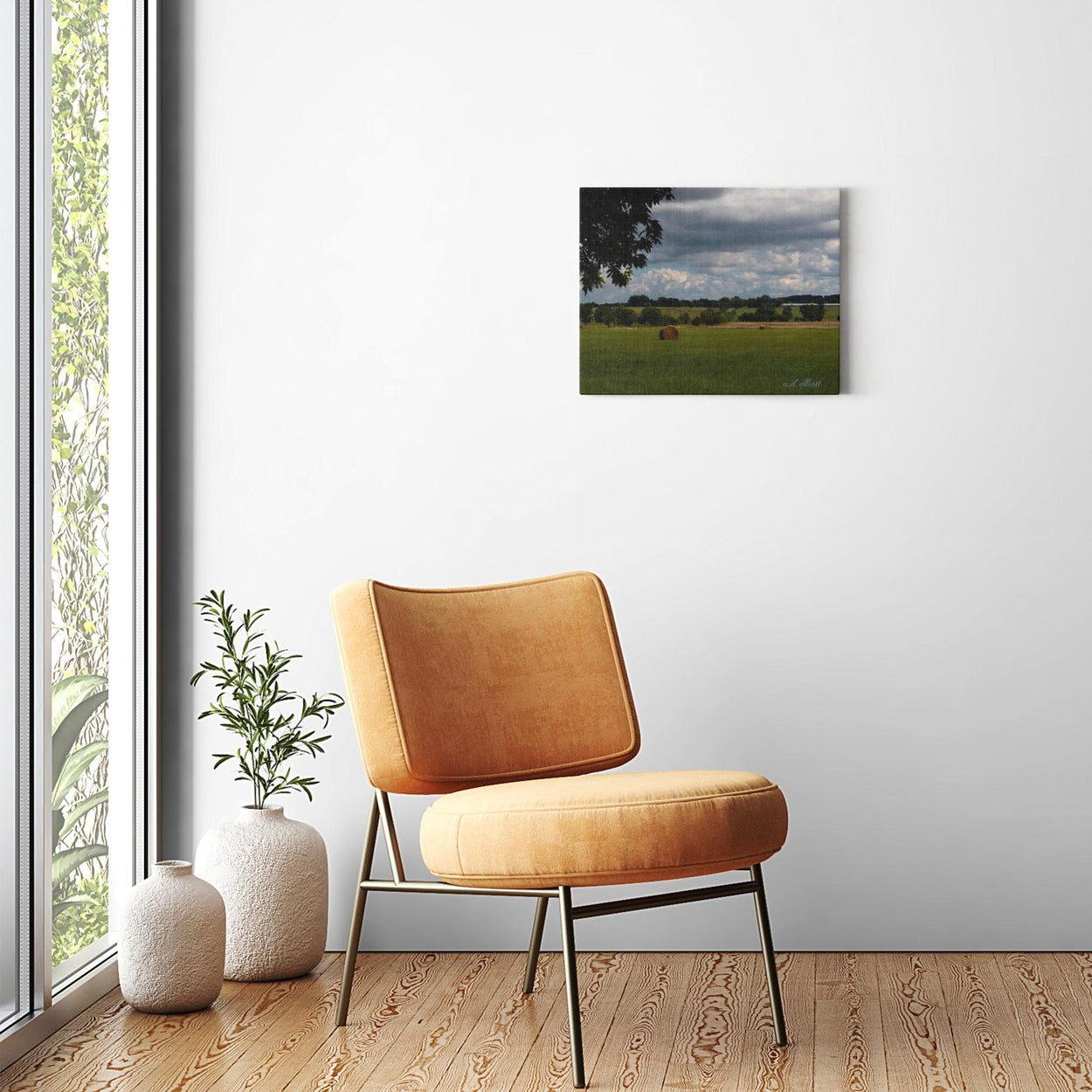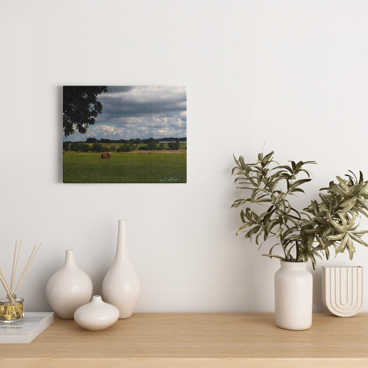 Experience the serene beauty of rural landscapes with this stunning photograph by a.d. elliott, featuring a large field adorned with hay bales, a rustic barn, and trees set against a dramatic cloudy sky. This captivating image invites you to appreciate the tranquility of nature. Available in print sizes ranging from 8X10 to 24X30, each piece is printed on high-quality, artist-grade stock and elegantly folded around a lightweight frame, ensuring a gorgeous, gallery-ready appearance that enhances any space.