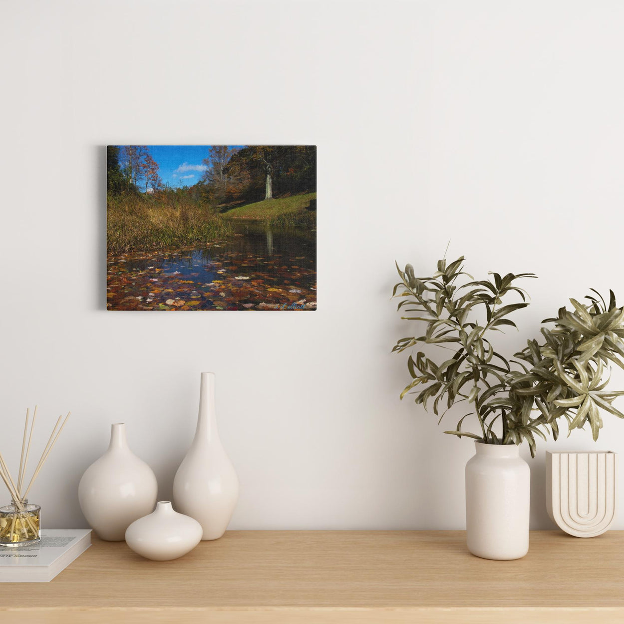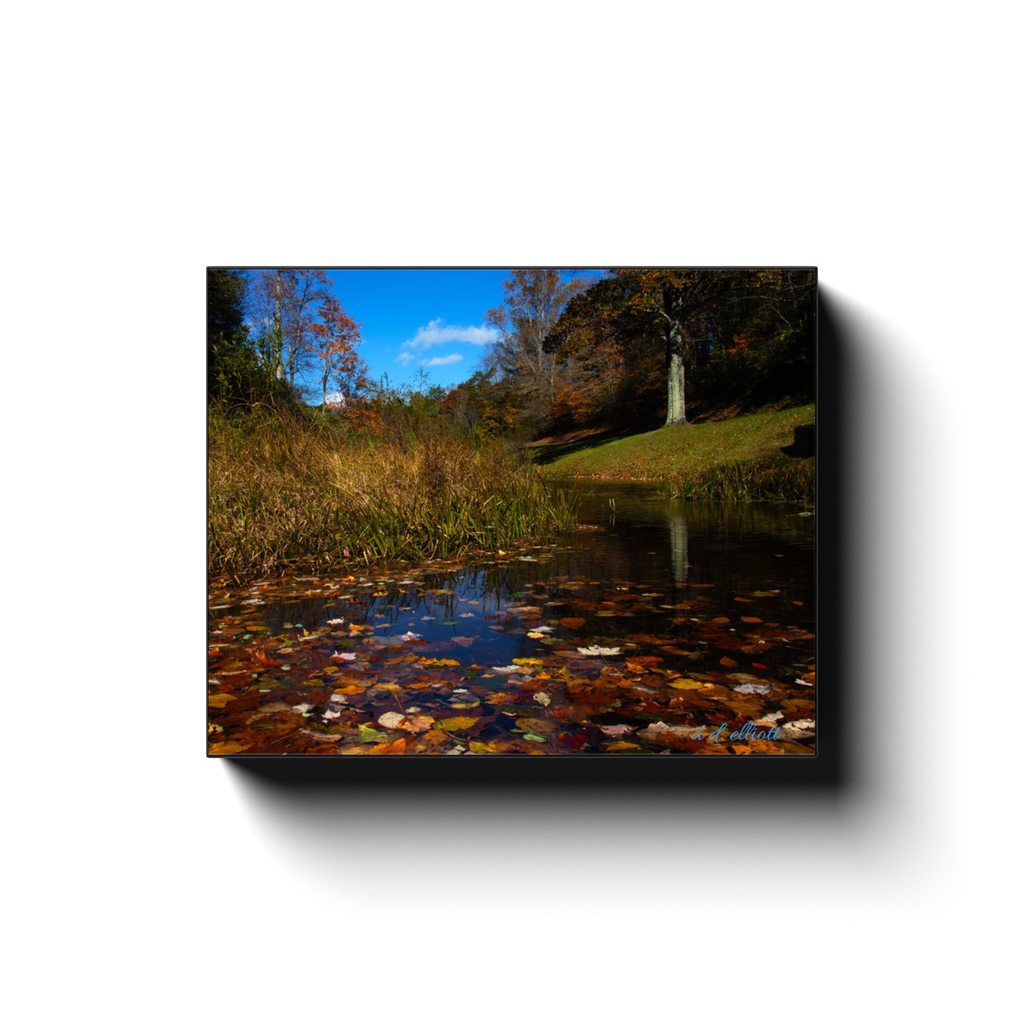 Experience the serene beauty of autumn with the "Autumn Reflections" canvas print, featuring a stunning photograph of Rake's Mill Pond on the Blue Ridge Parkway near Roanoke, Virginia, captured by renowned photographer a.d. elliott This exquisite piece showcases vibrant fall colors mirrored in tranquil waters, inviting a sense of peace and nostalgia into any space. 2. Available in sizes ranging from 8x10 to 24x30, each print is crafted on high-quality, artist-grade stock and elegantly folded around a lightweight frame, ensuring a gallery-ready look. Please allow 14 to 21 days for delivery as you bring a touch of nature's splendor into your home.