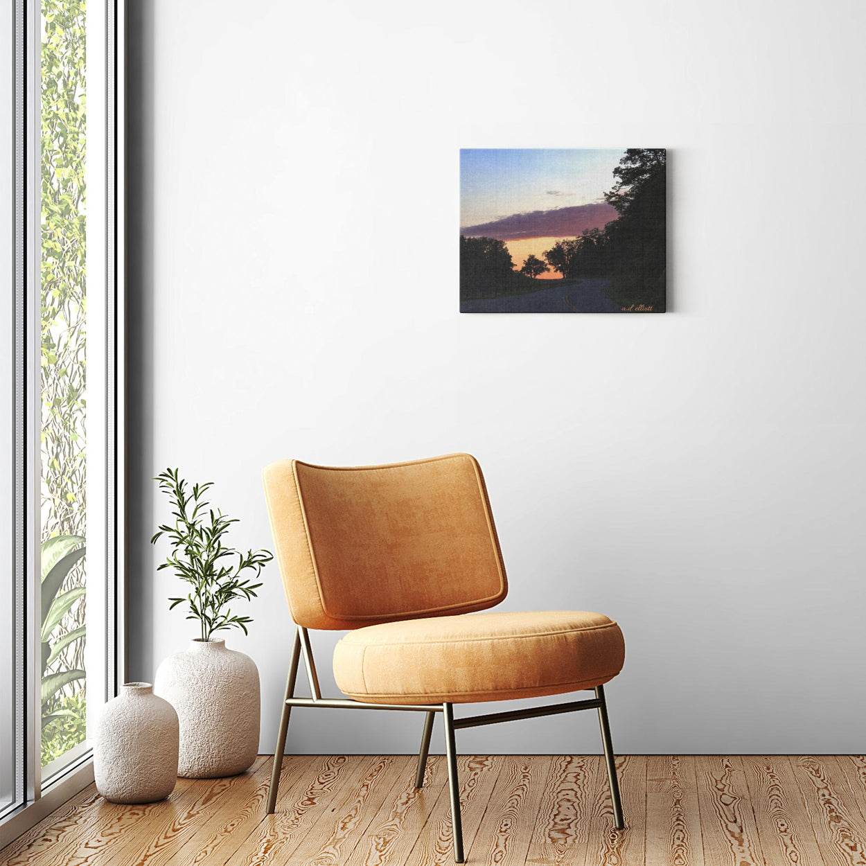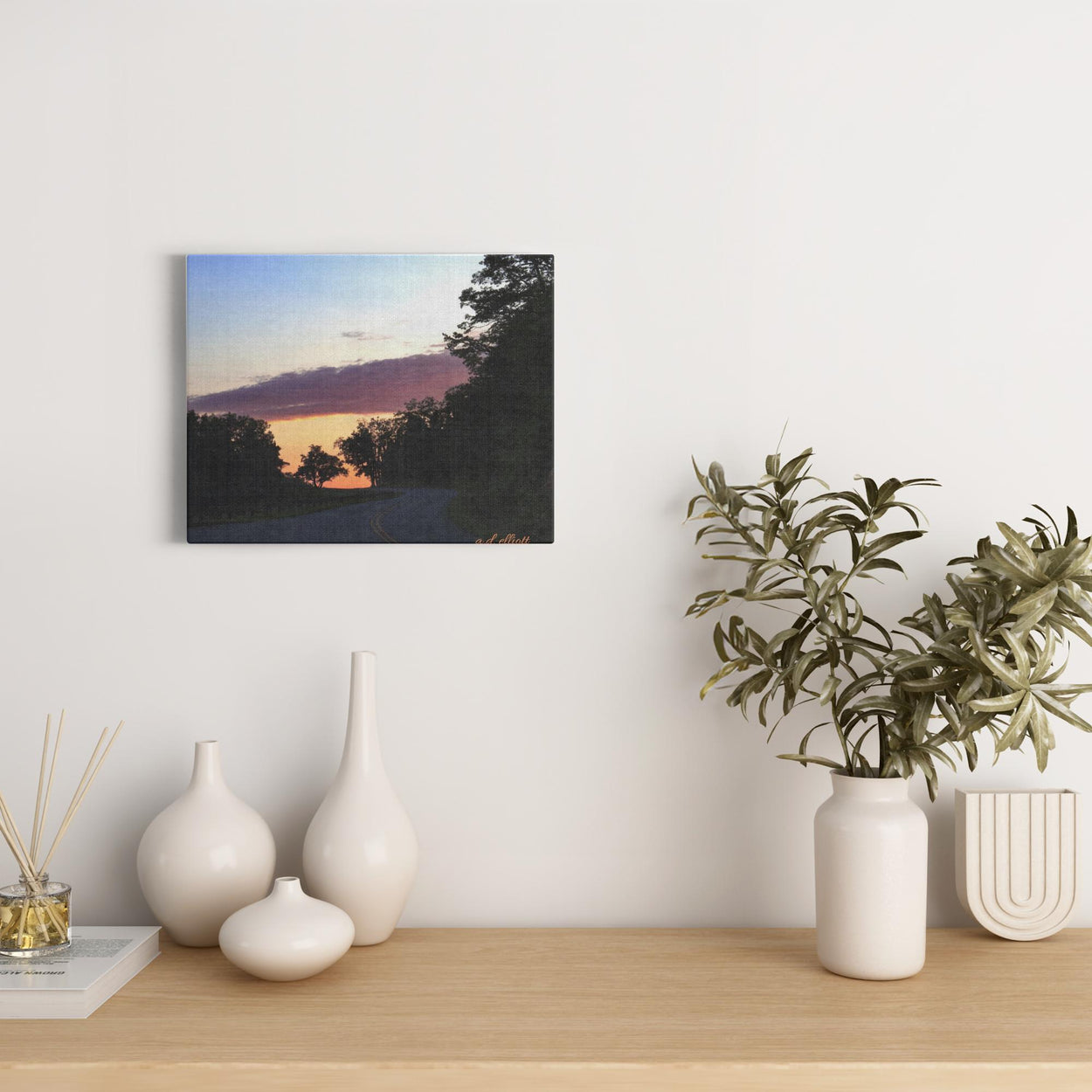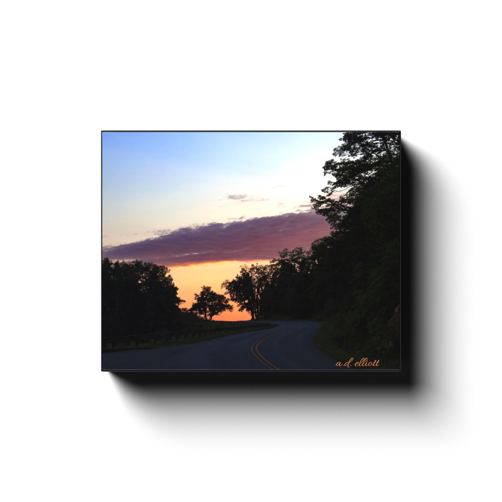 Experience the serene beauty of the Blue Ridge Highway at sunset with this stunning landscape photograph by a.d. elliott. Captured near Roanoke, Virginia, the image showcases a picturesque road framed by majestic trees under a vibrant sky, inviting you to take the back roads and embrace nature's tranquility. Available in print sizes ranging from 8x10 to 24x30, each piece is printed on high-quality, artist-grade stock and elegantly folded around a lightweight frame, ensuring a gallery-ready presentation. Please allow 14 to 21 days for delivery to enjoy this breathtaking view in your home or office.
